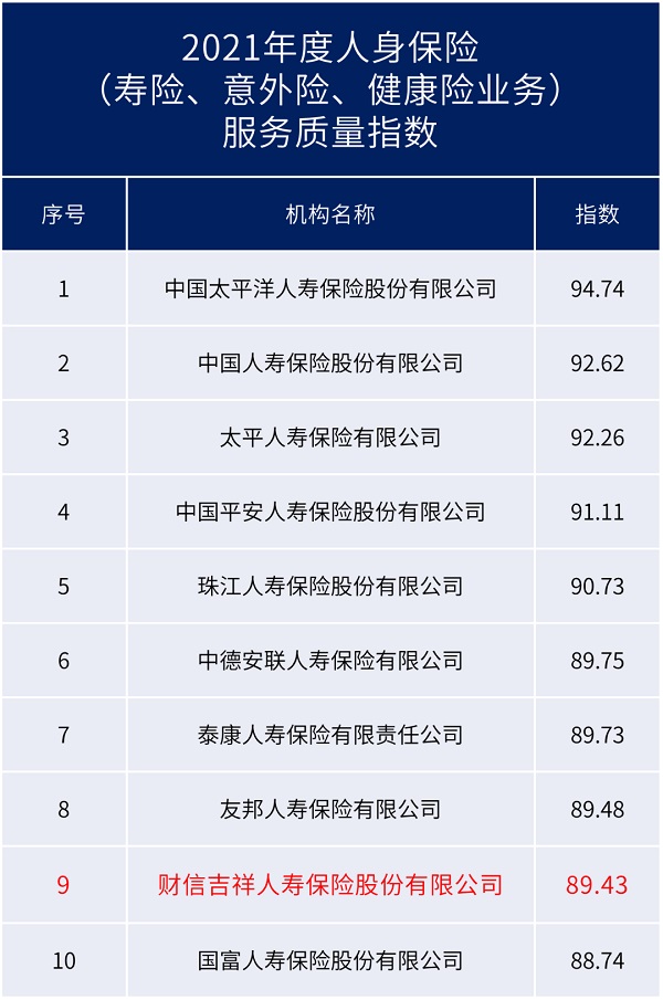 3月29日,中国银保信发布2021年度保险服务质量指数,财信人寿以89.43分在有统计的79家人身保险公司中排名第九,高于人身保险行业服务质量指数(87.29分)2.14分。