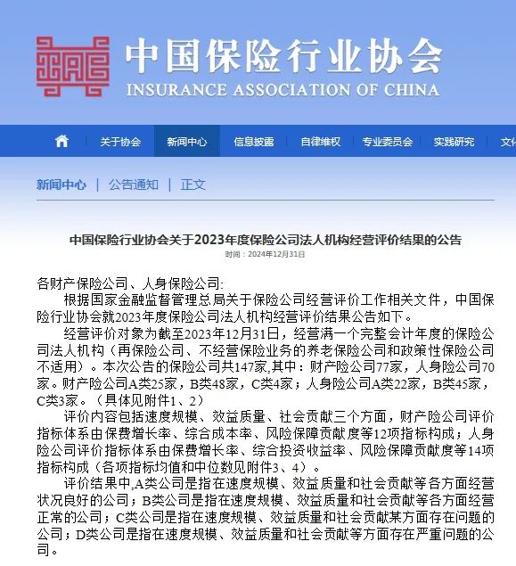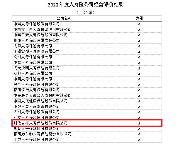 2024年最后一天,根据国家金融监督管理总局关于保险公司经营评价工作相关文件,中国保险行业协会公布2023年度保险公司法人机构经营评价结果,财信人寿首获A类评价。