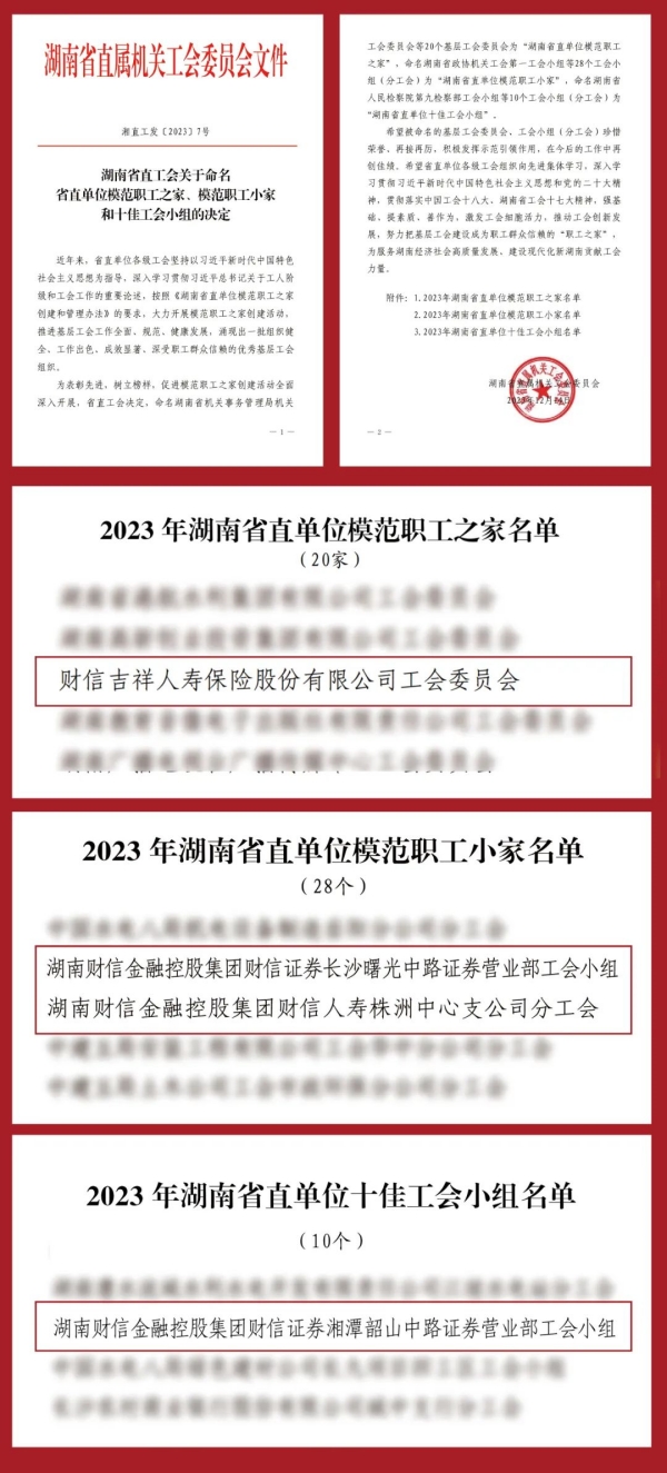 近日,湖南省直工会印发《关于命名省直单位模范职工之家、模范职工小家和十佳工会小组的决定》,财信人寿工会委员会被命名为“2023年湖南省直单位模范职工之家”,财信证券长沙曙光中路证券营业部工会小组、财信人寿株洲中心支公司分工会被命名为“2023年湖南省直单位模范职工小家”,财信证券湘潭韶山中路证券营业部工会小组被命名为“2023年湖南省直单位十佳工会小组”。