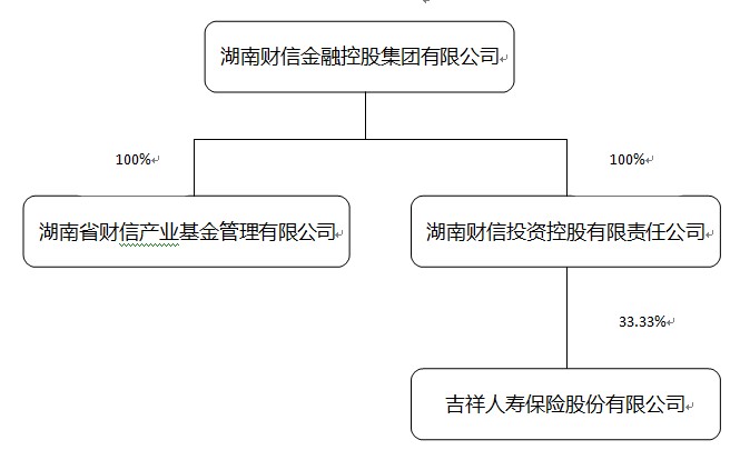 | 由于湖南财信投资控股有限责任公司持有吉祥人寿保险股份有限公司33.33%的股份,而湖南省财信产业基金管理有限公司和湖南财信投资控股有限责任公司都是湖南财信金融控股集团有限公司的全资子公司,根据中国银保监会相关文件规定,湖南省财信产业基金管理有限公司为我司的关联方。关联关系如下图所示: |