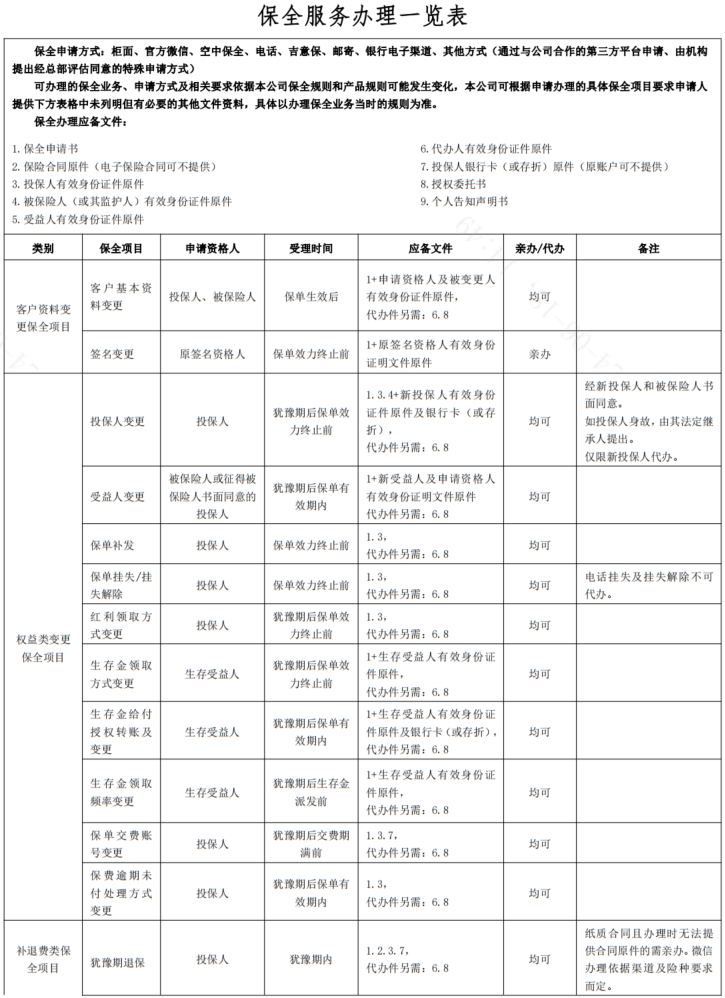 (3)部分保全业务不得委托他人办理,需您备齐所需资料亲自临柜或通过线上终端办理,需亲办的保全项目详见“保全服务办理一览表”。